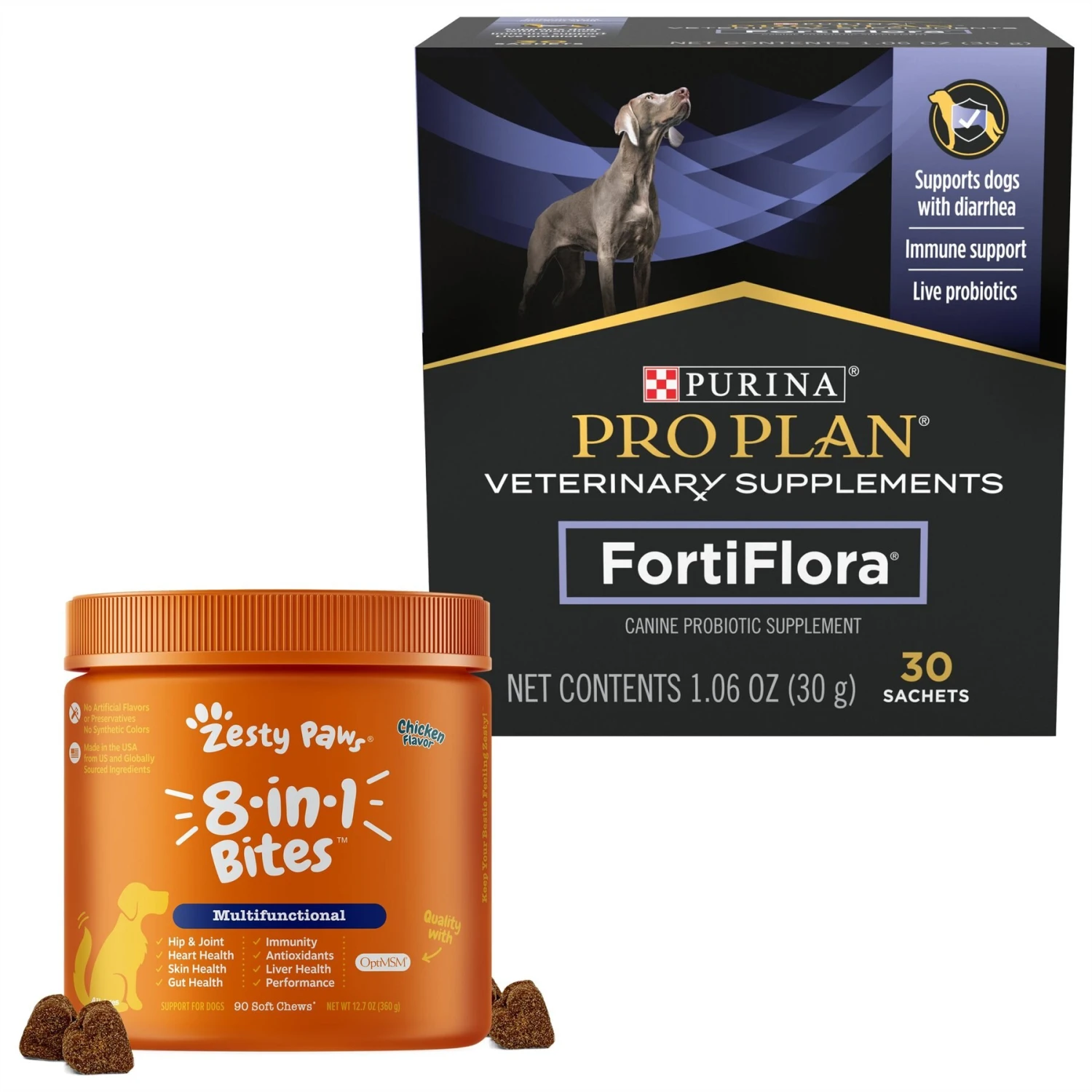 Help keep your furry buddy’s belly healthy with the Purina Pro Plan Veterinary Diets FortiFlora Powder Digestive Supplement + Zesty Paws Core Elements 8-in-1 Chicken Flavored Chews Multivitamin for Dogs! This great-tasting probiotic supplement powder is specially formulated to promote normal intestinal microflora in dogs suffering from diarrhea. It is crafted in collaboration with nutritionists, researchers and veterinarians to contain a specific amount of live microorganisms and antioxidants to help support digestive health and reduce gas. Plus, these functional supplements support hip and joint function, heart health, skin health, gut function, the immune system, antioxidant activity, liver health, and performance for adult and even senior dogs — small, medium, or large, and regardless of breed. That’s because this chewable functional supplement contains premium ingredients like Glucosamine, Chondroitin, a Gut Health Blend, Probiotics (including Lactobacillus acidophilus) and enzymes for gut health, and a whole lot more!