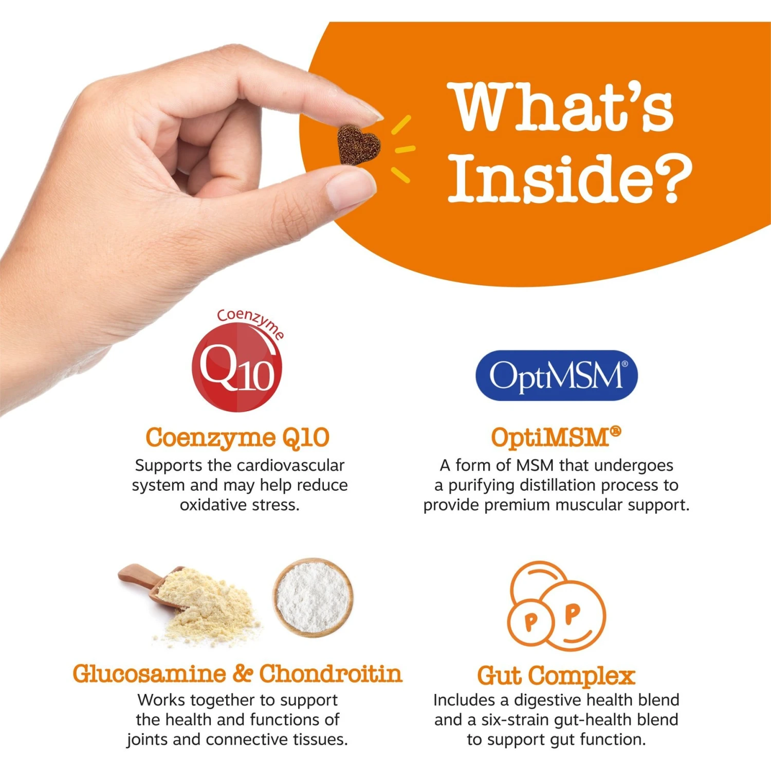 - Features MSM and a glucosamine chondroitin duo to support hips and joints, plus cod liver fish oil and a proprietary multivitamin blend to support canine performance and mobility.