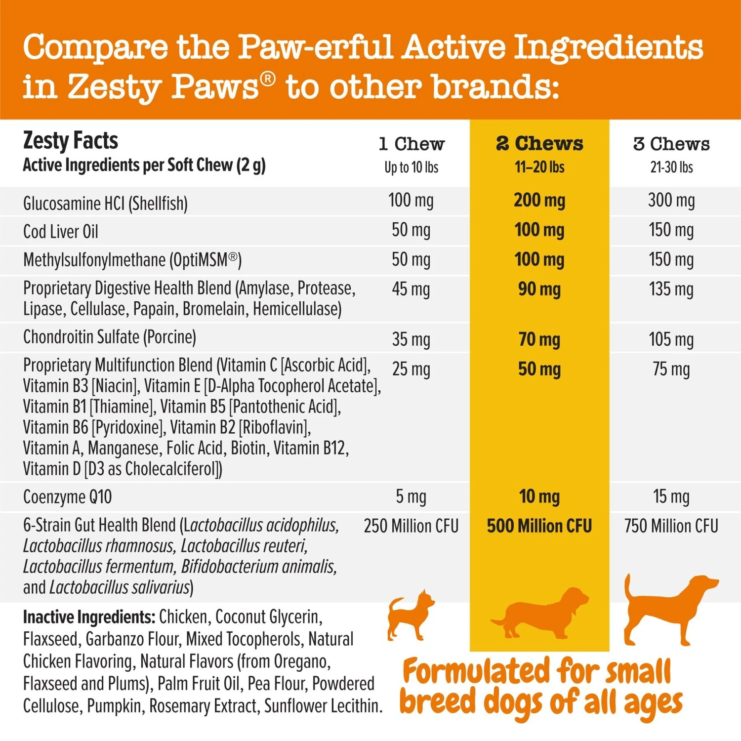 Zesty Paws 8-in-1 Chicken Flavored Mini Soft Chew Multivitamin Dog Supplement premium soft chews that provide eight great multifunctional benefits for your dog’s overall support. These functional supplements support hip and joint function, heart health, skin health, gut function, the immune system, antioxidant activity, liver health and performance for small adult and senior dogs. That’s because this chewable functional supplement contains glucosamine, chondroitin, a gut health blend (including lactobacillus acidophilus), a digestive health blend and a whole lot more! Best of all, these mini doggie chewables taste delicious and pet parents can let out a sigh of relief knowing that their canine companions will get the multi-functional support to keep them feeling zesty and happy!