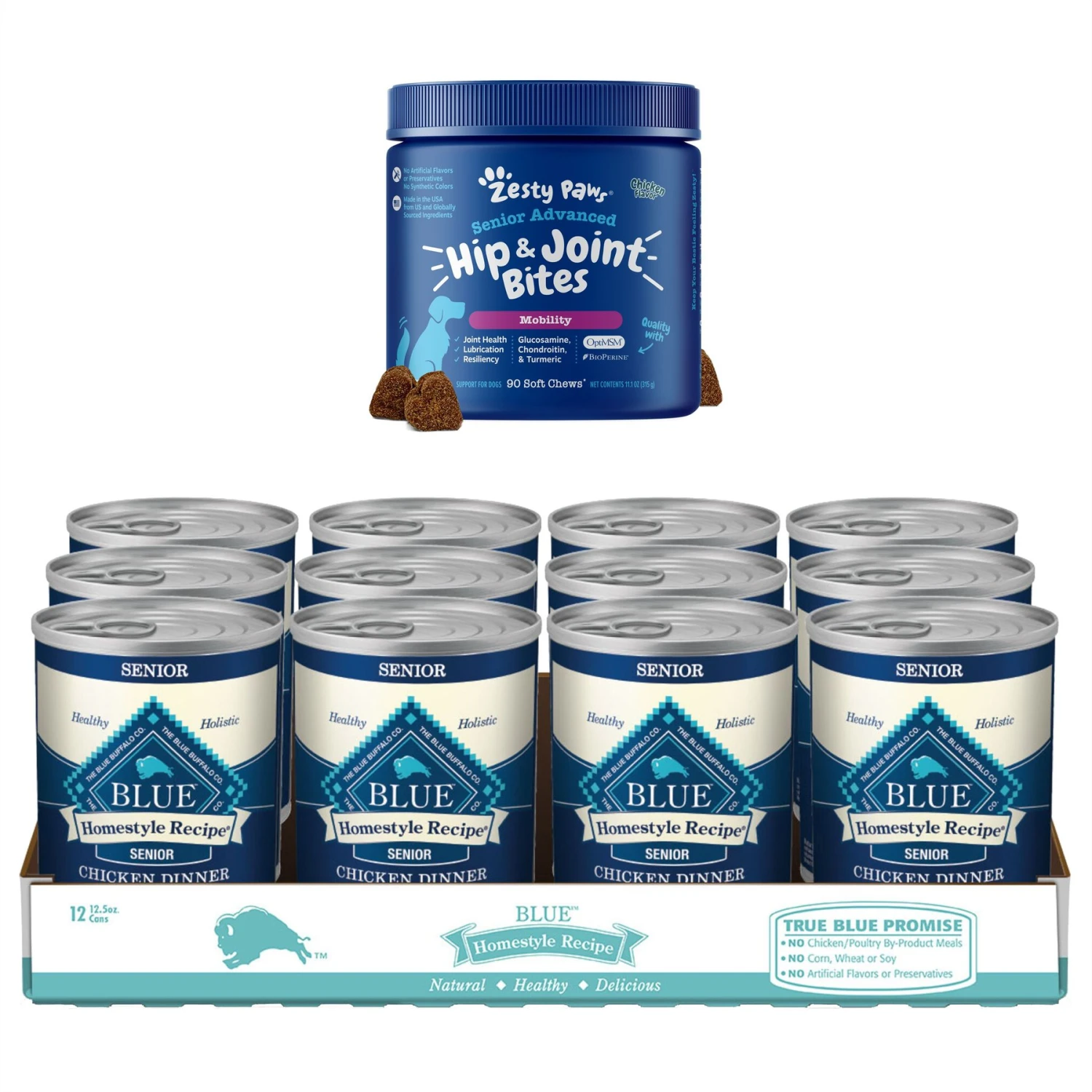 Take care of your older amigo with Zesty Paws Advanced Mobility Chicken Flavored Chews Joint Supplement + Blue Buffalo Homestyle Recipe Chicken Dinner with Garden Vegetables Canned Food for Senior Dogs. This Zesty Paws supplement features OptiMSM, a form of MSM that provides premium muscular support, plus Qmin+ (Curcumin) to provide premium support for hips and joints and BioPerine (black pepper extract) to support the Curcumin’s absorption. These ingredients, along with glucosamine HCl, chondroitin sulfate, green lipped mussel, vitamin C, vitamin E, and hyaluronic acid, support hips, joints, connective tissue and cartilage for dogs. Meanwhile, Blue Buffalo’s irresistibly tasty wet food starts with high-quality protein from tender pieces of chicken, is packed with garden fruits and veggies then enhanced with vitamins and minerals like glucosamine and chondroitin. Formulated to help support healthy muscle maintenance, this pate-style food is made with wholesome ingredients that do not contain any by-product meals, corn, wheat, soy, artificial flavors or preservatives.