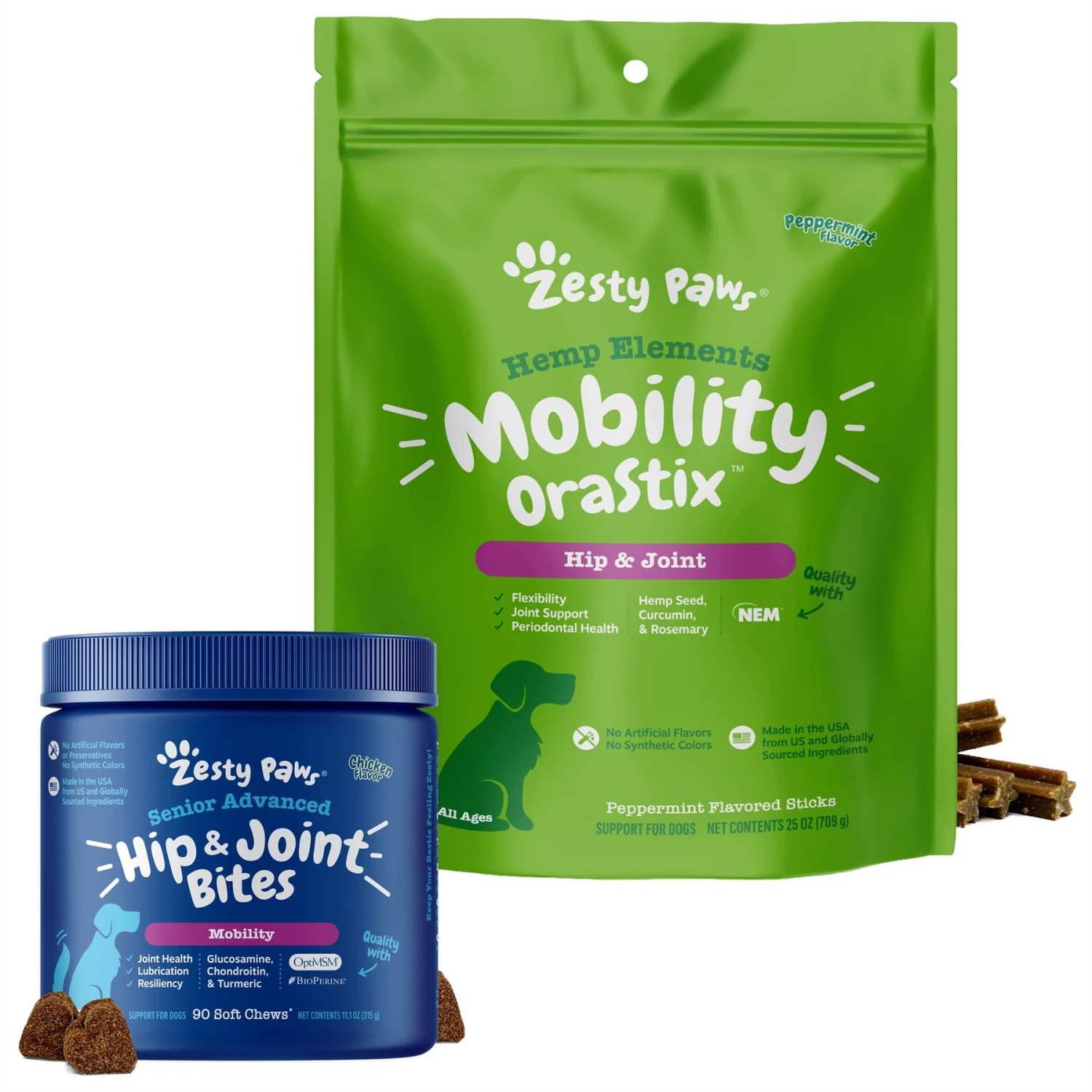 Keep your canine movin’ and groovin’ all day long with Zesty Paws Advanced Mobility Chicken Flavored Chews Joint Supplement for Senior Dogs + Mobility OraStix Mint Flavored Dental Chews! These Advanced Mobility Bites provide hip and joint support to keep senior dogs jumping for joy. This functional chewable dog supplement features OptiMSM, a form of MSM that provides premium muscular support, plus Qmin+ (Curcumin) to provide premium support for hips and joints and BioPerine (black pepper extract) to support the Curcumin’s absorption. And these Mobility OraStix feature Hemp Seed Powder, Curcumin, Eggshell Membrane, and other pawsome ingredients that may support hip and joint health, while helping keep your dog’s teeth healthy and clean.