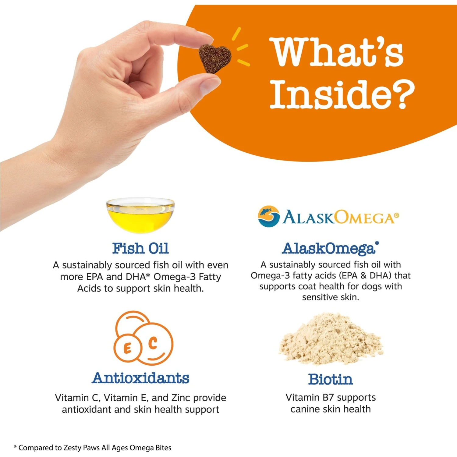 Keep your sidekick looking and feeling his best with Zesty Paws Advanced Omega Bites Chicken Flavor Soft Chews Skin & Coat Supplement for Senior Dogs. As your dog ages, common skin conditions like redness and scaling can be a sign of bigger health issues such as vitamin deficiencies, allergies and more. This senior supplement features ingredients like fish oil, algae-derived DHA plus a unique antioxidant and skin health blend to help keep your pal feeling Zesty in their golden years. Your dog will love this supplement’s delicious flavor and soft, treat-like texture, while you’ll love knowing they support strong, healthy skin. Treat your furbaby to good health with Zesty Paws!