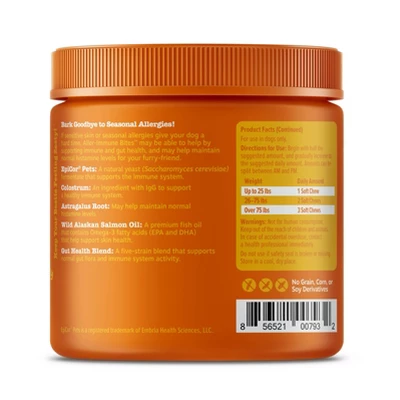 At Zesty Paws, we know that pet parents worry about sensitive skin & want to provide seasonal allergy support for dogs and relief for you. Aller-Immune Bites are here for you! Made with EpiCor, wild caught Alaskan Salmon Fish Oil (with omegas for fatty acid support for immune health), Colostrum, Astragalus Root, a Probiotic blend, and Apple Cider Vinegar, this soft chew formula provides seasonal allergy support, along with supporting the immune system, skin health, and normal gut flora. These chews may also help maintain normal histamine levels for canine pets, no matter the breed and for all ages.Plus, we know your pet is anti bad flavors. So best of all, these chews taste amazing (trust us, we have a hot spot where official four-legged testers tell us), which will give Fido an itch for more, and you’ll enjoy the daily relief of giving your pup the best solution for their gut and immune function, along with not having to deal with giving your dog big pills or tablets! Fido will feel spoiled well with max special treatment to keep feeling good and zesty, which treats you to even more fun and fond memories that they’re itching to give!