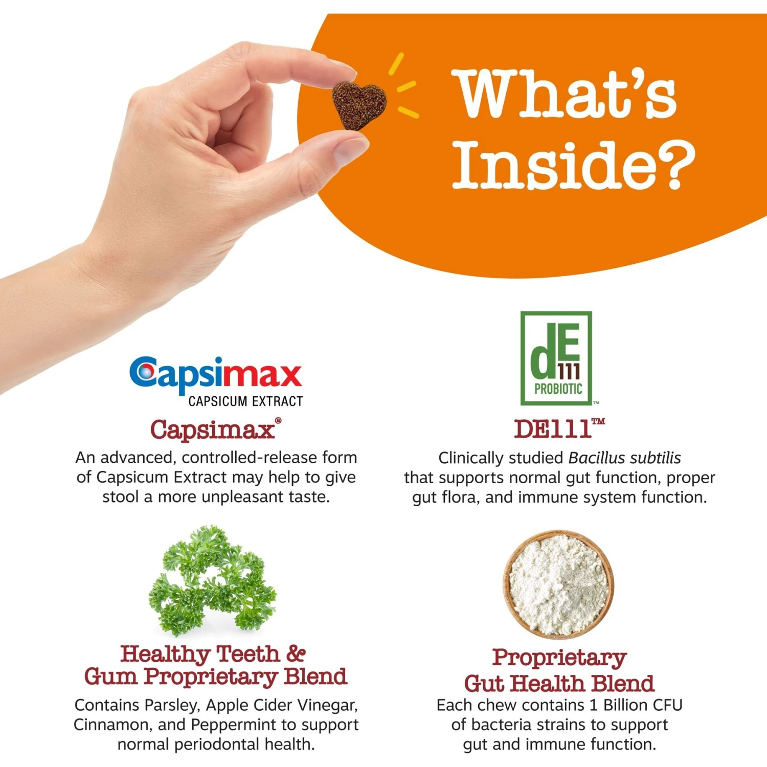 - These chewables feature an ancient grain base plus functional ingredients to help deter stool eating and provide gut, periodontal, and immune support.