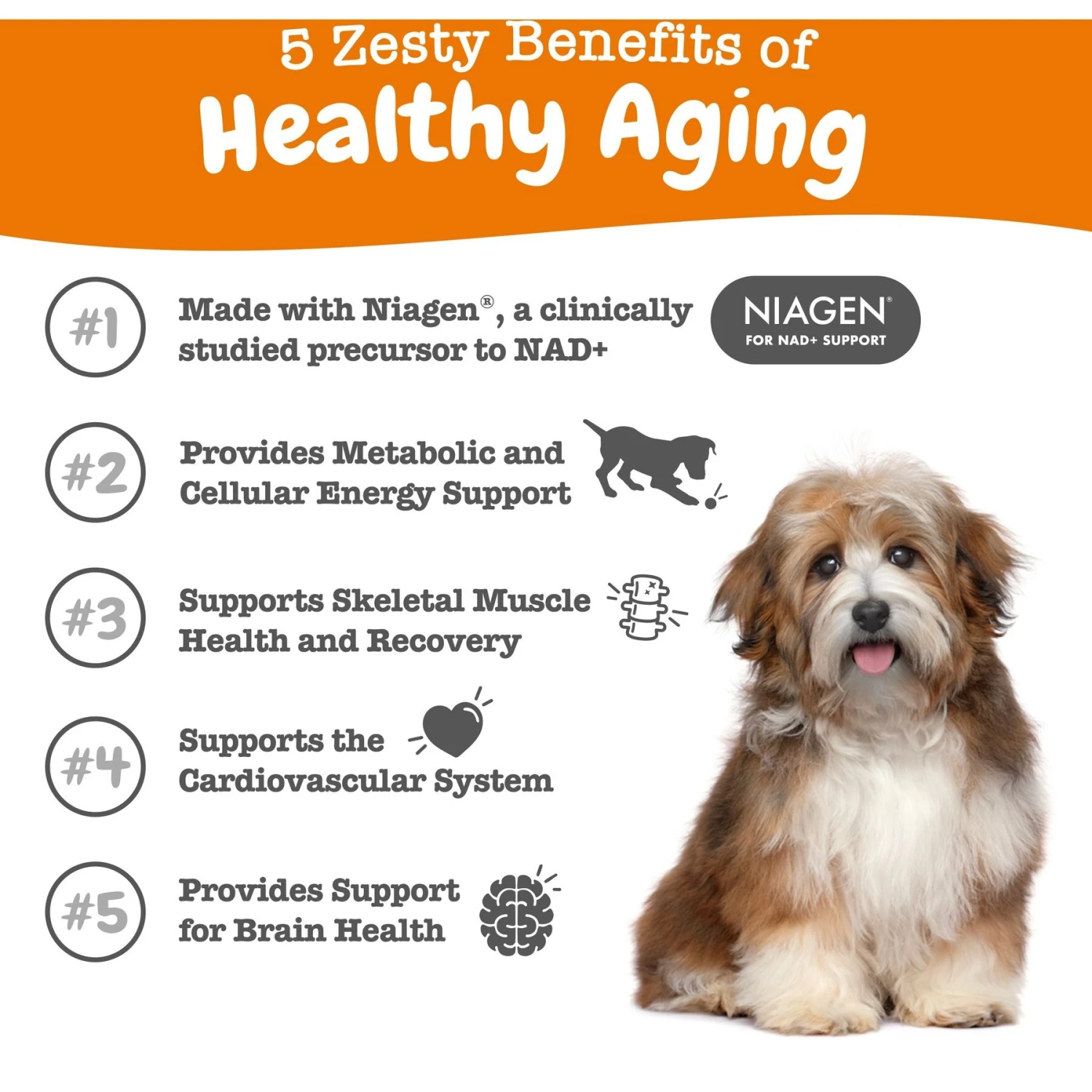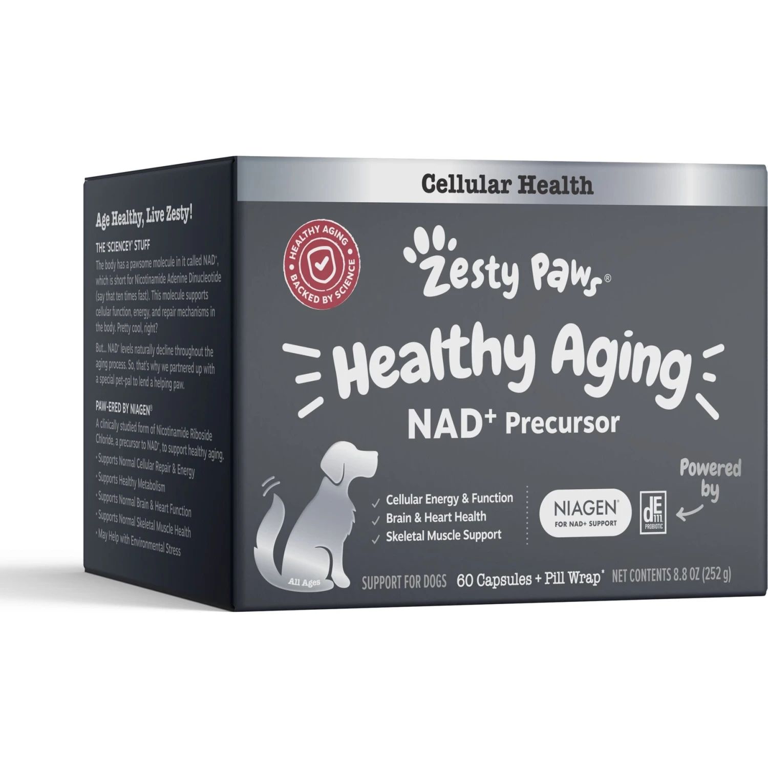 Zesty Paws Healthy Aging NAD+ Precursor Cellular Health Supplements and Probiotic Paste for Dogs bundled set is a paw-some way to support your best friend’s health as he ages. These capsules provide cellular, metabolic, heart, brain and overall skeletal health support. They support cellular function, energy and bodily repair mechanisms, so your furbaby’s body is better able to function and recover, keeping your dog feeling zesty! Give the capsule to your pup with Zesty Paws Probiotic Paste for the ultimate, delicious pairing!