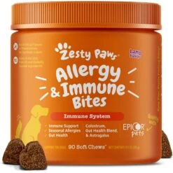 Zesty Paws Calming Bites Peanut Butter Flavored Soft Chews Calming Supplement for Dogs, 90 count—Zesty Paws Calming Bites are premium chewables that may help dogs with normal stress, nervousness and hyperactivity to help them stay calm and at ease! This functional dog supplement features suntheanine—an advanced form of L-theanine—along with sensoril ashwagandha. Together, these advanced ingredients help support relaxation, calmness and composure for your canine companion. Plus, these soft chews also include chamomile, valerian root and L-tryptophan for additional support to help calm and relax your pup. Best of all, pets love the delicious taste! So, instead of feeling anxiety about helping our canine companions, pet moms and dads can treat themselves to a sigh of quiet relief knowing that their doggy could become a pro at composure and feeling too cool for a thunderstorm, separation, fireworks, car rides and travel or other moments of normal stress. That way, there’s less asking yourself, “How in the world do I calm my dog?” and more time feeling good and zesty—which treats you to even more fun and fond memories!
