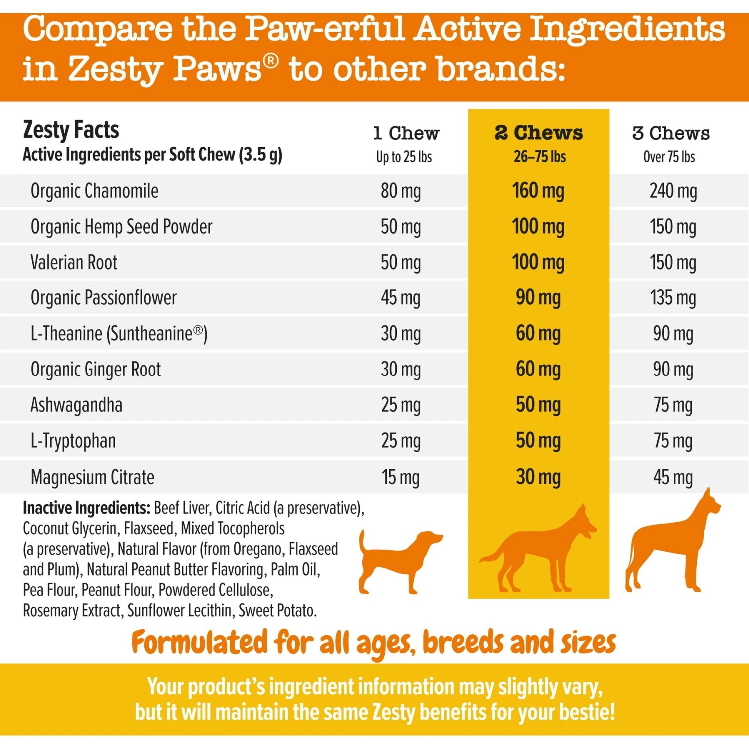 Zesty Paws Calming Bites are premium chewables that may help dogs with normal stress, nervousness, and hyperactivity to help them stay calm and at ease! This functional dog supplement features suntheanine, an advanced form of L-theanine along with sensoril ashwagandha. Together, these advanced ingredients help support relaxation, calmness, and composure for your canine companion. Plus, these soft chews also include chamomile, valerian root, and L-tryptophan for additional support to help calm and relax your pup. Best of all, pets love the delicious taste! So, instead of feeling anxiety about helping our canine companions, pet moms and dads can treat themselves to a sigh of quiet relief knowing that their doggy could become a pro at composure and feeling too cool for a thunderstorm, separation, fireworks, car rides and travel, and other moments of normal stress. That way, there’s less asking yourself “how in the world do I calm my dog?” and more time feeling good and zesty, which treats you to even more fun and fond memories!
