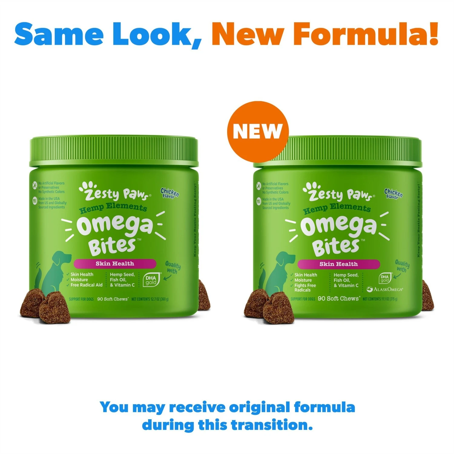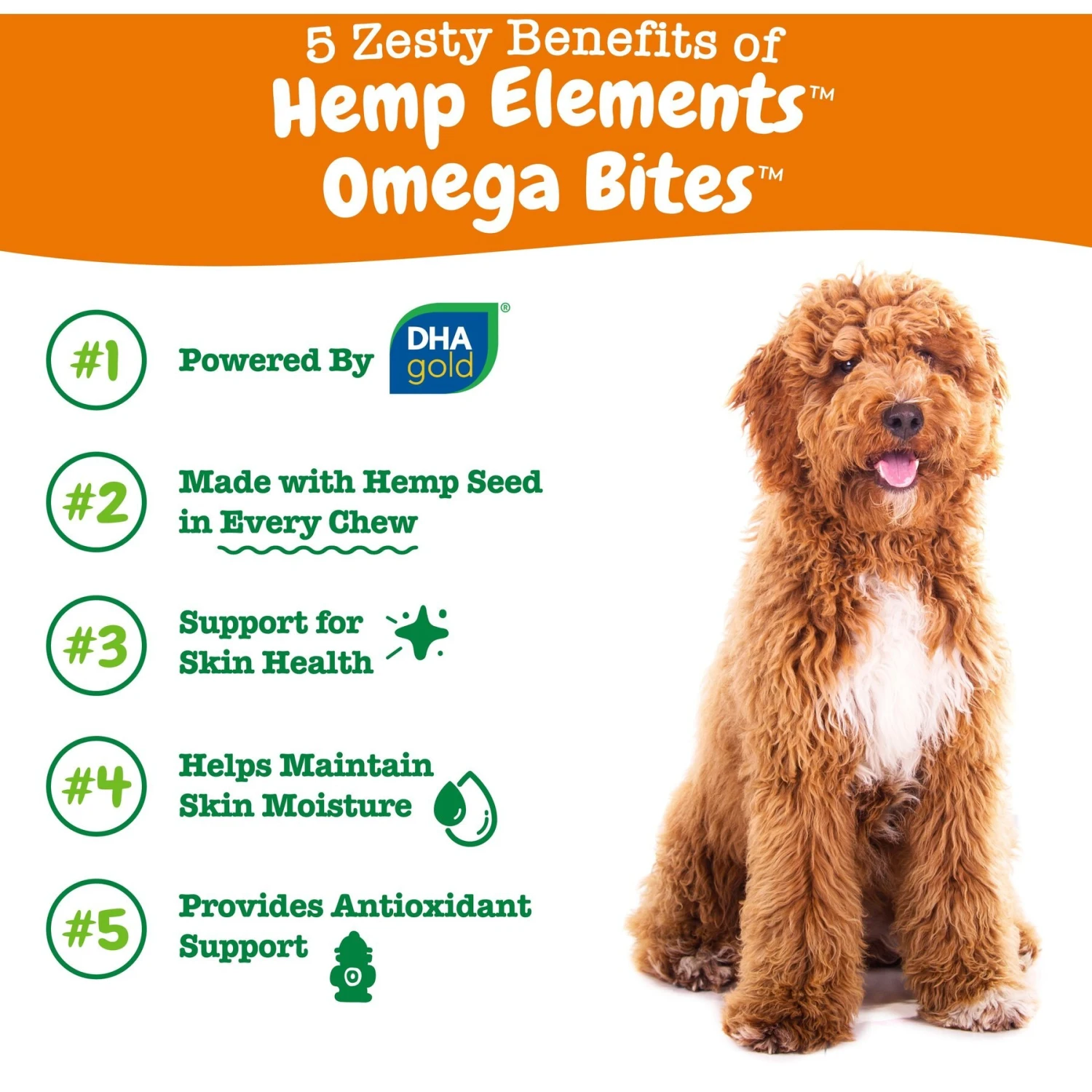 - Hemp Elements Omega Bites contain hemp seed, fish oil and vitamins C and E that work together to support skin health and immune function for dogs of all ages.