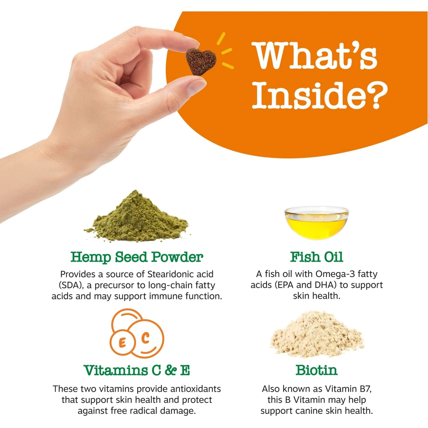 - These soft chews also include cod liver oil, biotin (vitamin B7), zinc, and vitamin E to provide additional antioxidants and support for your dog’s skin health.