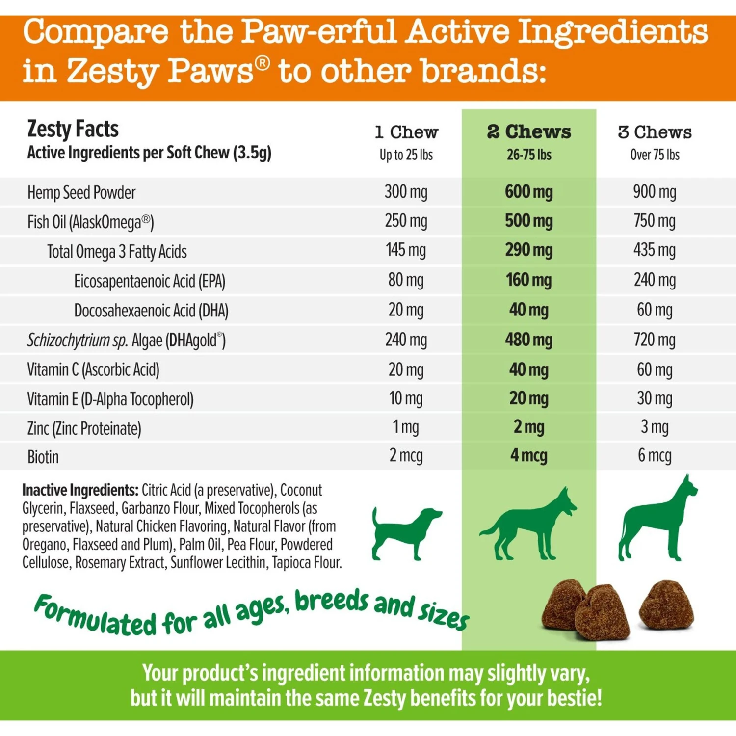 Your four-legged friend should feel fantastic in their own fur—that’s why Zesty Paws made Zesty Paws Hemp Elements Omega Bites Chicken Flavored Soft Chews Skin & Coat Supplement for Dogs. These delicious chicken-flavored soft chews provide omega-3 fatty acids (EPA and DHA) to support skin health. Each chew features premium fish oil along with vitamins C and E plus biotin to promote healthy moisture content while also providing free radical support for your pup.