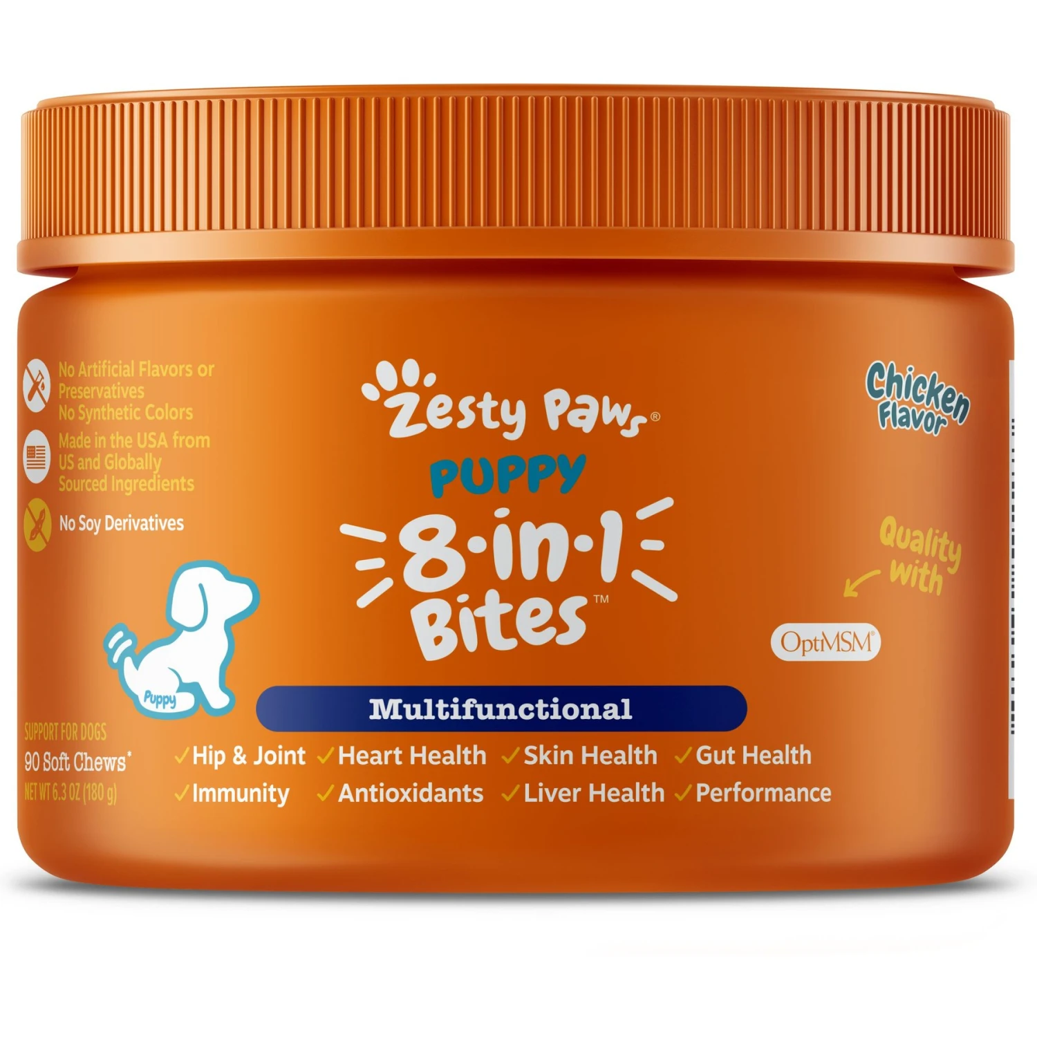Zesty Paws Puppy 8-in-1 Chicken Flavor Soft Chew Supplement for Dogs, 90 count—Zesty Paws Puppy Bites 8-in-1 Soft Chew Supplement for Dogs are veterinarian-formulated soft chews that provide multifunctional support for your growing puppy. These functional supplements support hip and joint function, heart health, skin health, gut function, the immune system, antioxidant activity, liver health and performance for small puppies. That’s because this chewable functional supplement contains glucosamine, chondroitin, a gut health blend (including lactobacillus acidophilus), a digestive health blend and a whole lot more! Best of all, these doggie chewables taste delicious! This supplement comes in two-gram, easy-to-chew bites to help small mouths chomp with ease. Then, when your puppy turns one, ramp up the fun and try Zesty Paws 8-in-1 Bites or 8-in-1 Mini Bites for small breeds (sold separately) to keep her Zesty for years to come!