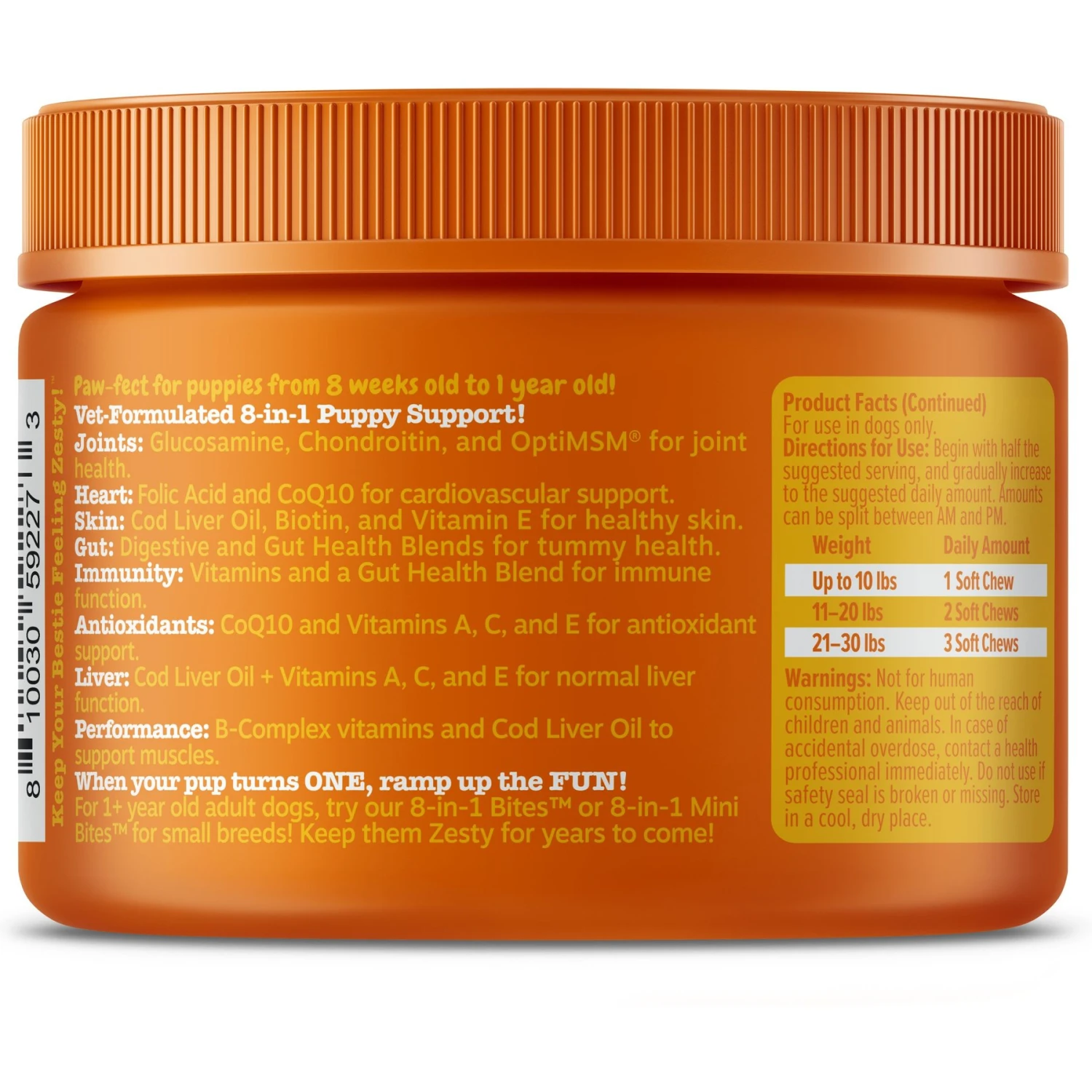 - This multifunctional soft chew supplement supports 8 areas of functional dog wellness for puppies from 8 weeks old to 1 year old.