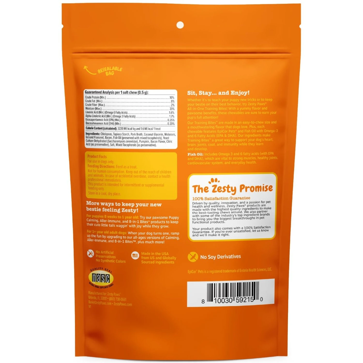 Zesty Paws All-in-One Bacon Flavored Soft & Chewy Training Bites Dog Treats, 8-oz bag—Whether it’s to teach your puppy new tricks or to keep your bestie on her best behavior, try Zesty Paws All-in-One Peanut Butter Flavored Soft & Chewy Training Bites Dog Treats! With a yummy flavor and paw-some benefits, these chewables are sure to earn your puppy’s full attention! Training Bites are made in an easy-to-chew size and a mouthwatering flavor that puppies love. Plus, each chewable features EpiCor Pets and fish oil with omega-3 and -6 fatty acids (EPA and DHA) in every bite. These ingredients make Training Bites a great way to support your puppy’s healthy heart, brain, joints, muscles, coat and immunity while she learns and grows. Best of all, these chews taste amazing, and are sure to give your pup an itch for more. You’ll enjoy the daily relief of giving your pup the best treat for your pup’s Zesty life, and your canine companion will wag her tail with joy because she will feel spoiled well with special treatment.