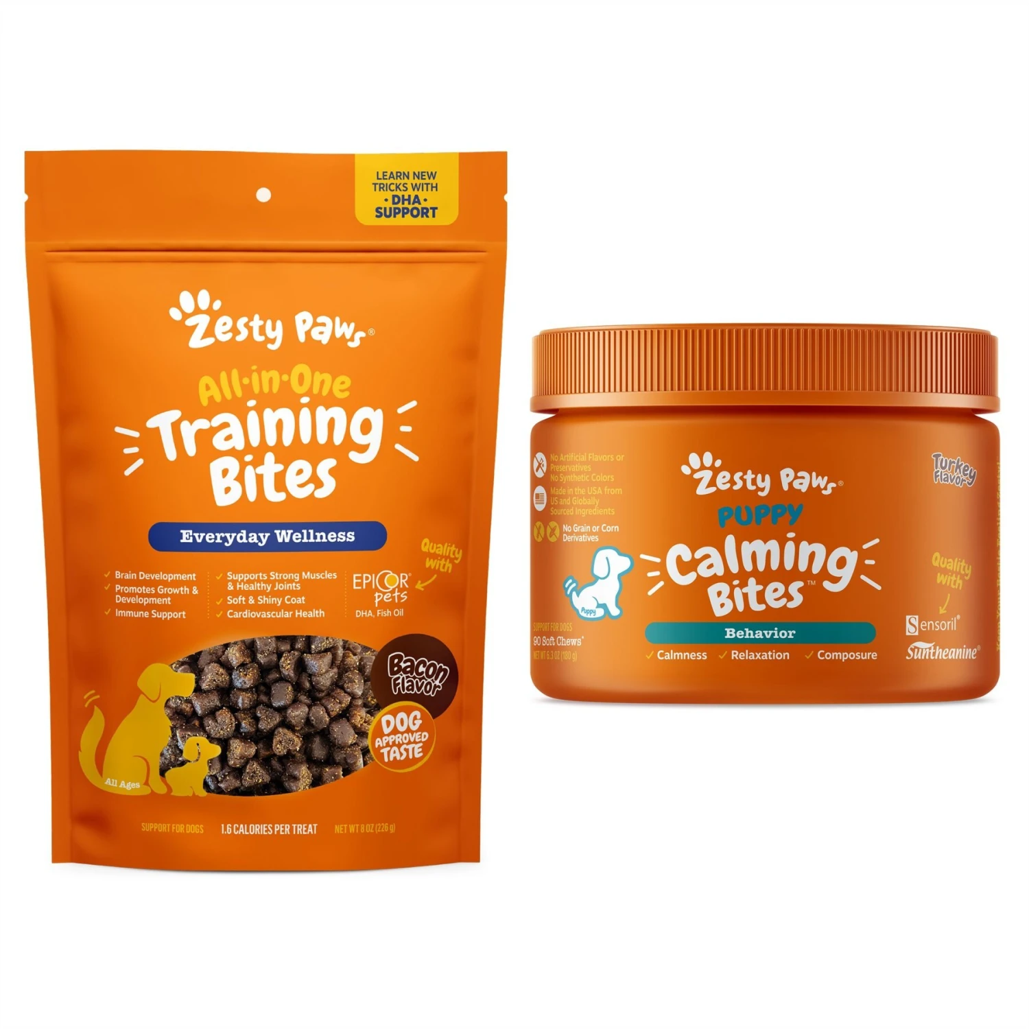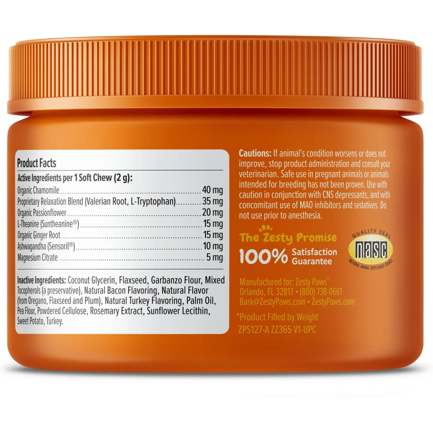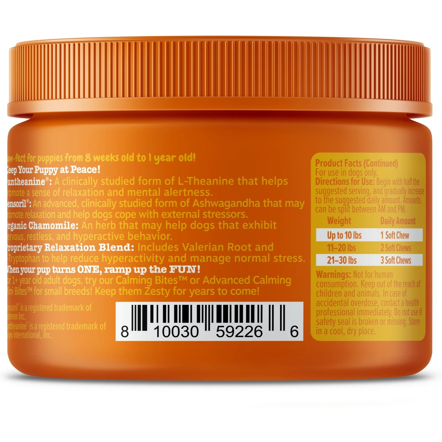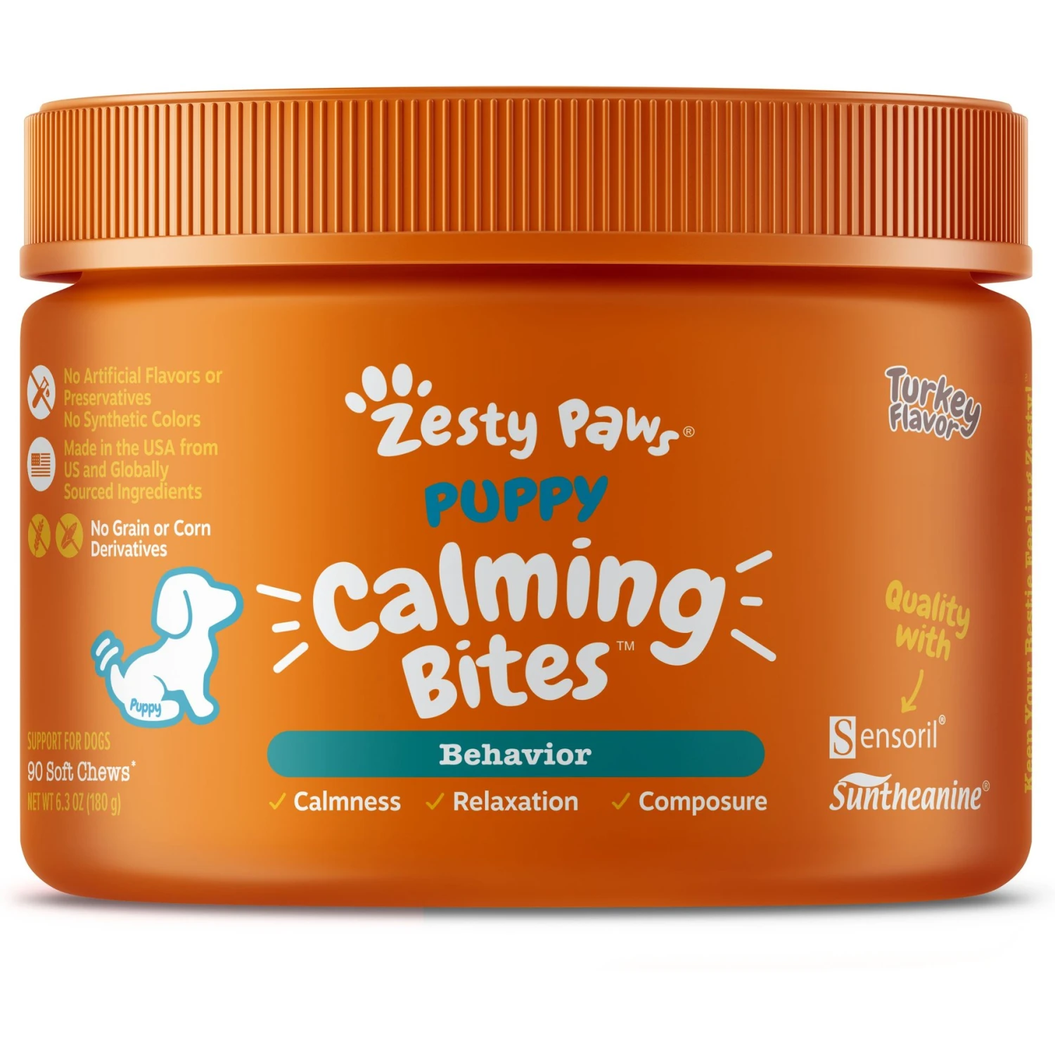 Zesty Paws Puppy Calming Bites Behavior Turkey Flavor Soft Chew Supplement for Dogs, 90 count—Help your puppy pal stay calm with Zesty Paws Puppy Bites Calming Soft Chew Supplement for Dogs. Whether it’s for thunderstorms, fireworks, people, other pets or other moments of normal stress, these veterinarian-formulated soft chews help support relaxation. They do this with ingredients like suntheanine—an advanced form of L-theanine—along with premium sensoril ashwagandha, chamomile, valerian root, L-tryptophan and more! Best of all, pets love the delicious taste that’ll make your pup let out a little bark of joy. This supplement is crafted as two-gram, easy-to-chew bites to help small mouths chomp with ease. Then, when your puppy turns one, ramp up the fun and try Zesty Paws Calming Bites or Advanced Calming Mini Bites (sold separately) for small breeds!