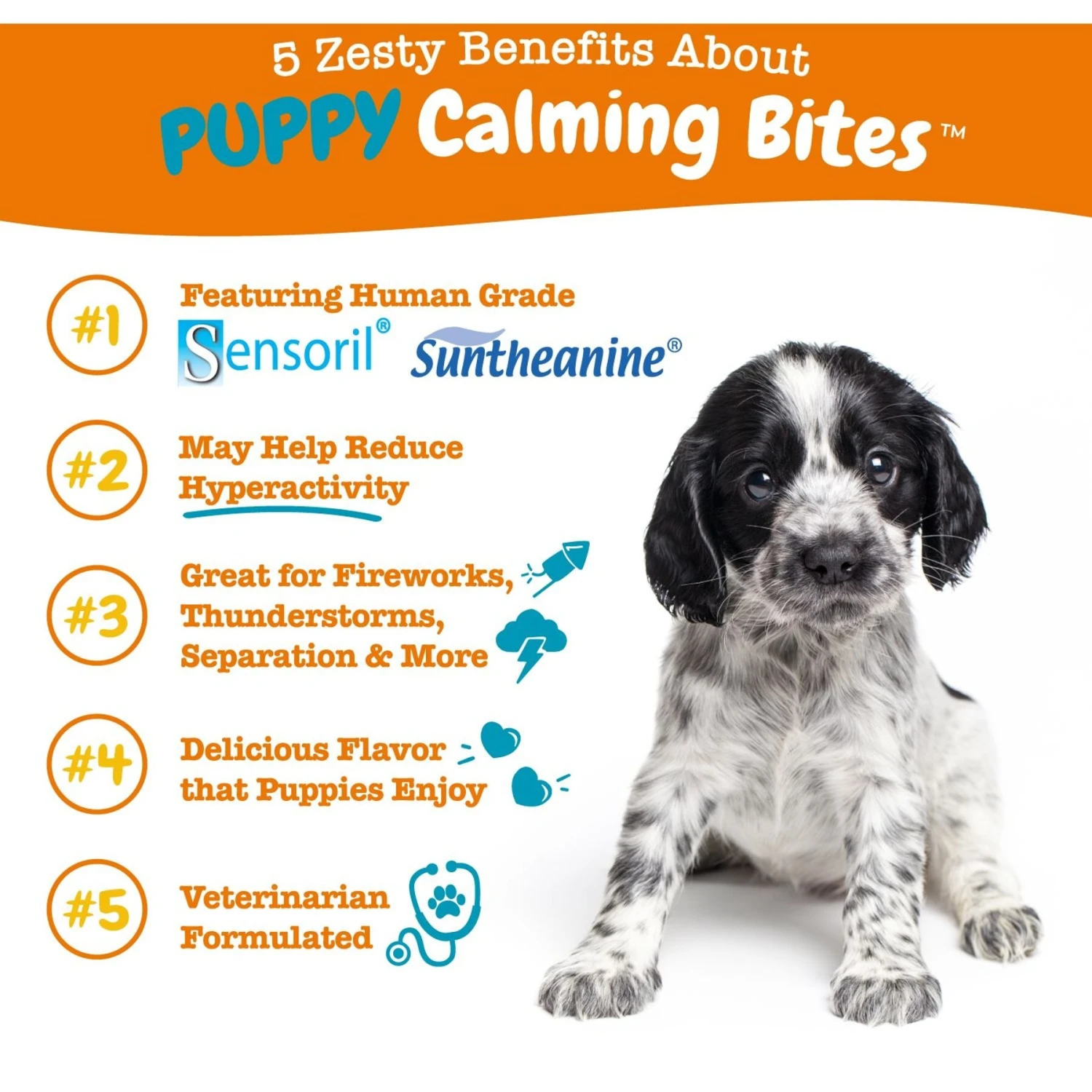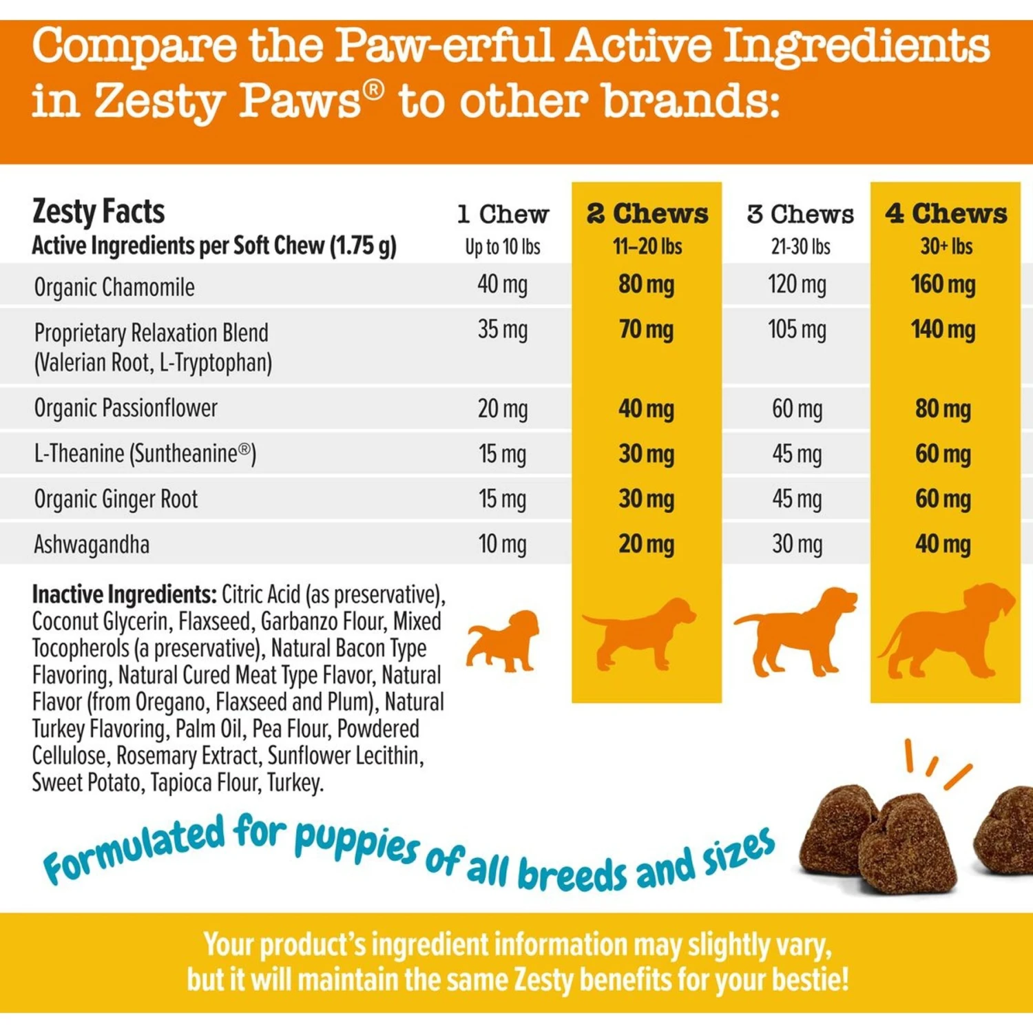 Help your puppy pal stay calm with Zesty Paws Puppy Bites Calming Soft Chew Supplement for Dogs. Whether it’s for thunderstorms, fireworks, people, other pets or other moments of normal stress these veterinarian-formulated soft chews help support relaxation. They do this with ingredients like suntheanine, an advanced form of L-Theanine along with premium sensoril ashwagandha, chamomile, valerian root, L-tryptophan, and more! Best of all, pets love the delicious taste that’ll make your pup let out a little bark of joy. This supplement is crafted as 2-gram, easy-to-chew bites to help small mouths chomp with ease. Then, when your puppy turns 1, ramp up the fun and try Zesty Paws Calming Bites or Advanced Calming Mini Bites (sold separately) for small breeds!