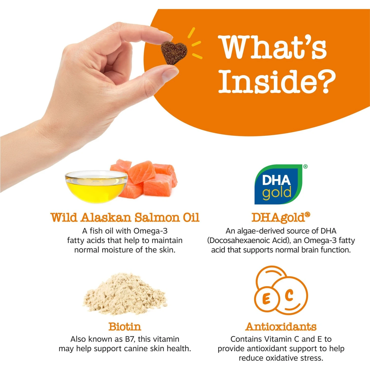- Each chew features DHAgold, an algae-derived source of DHA (docosahexaenoic acid), an omega-3 fatty acid that supports skin health.