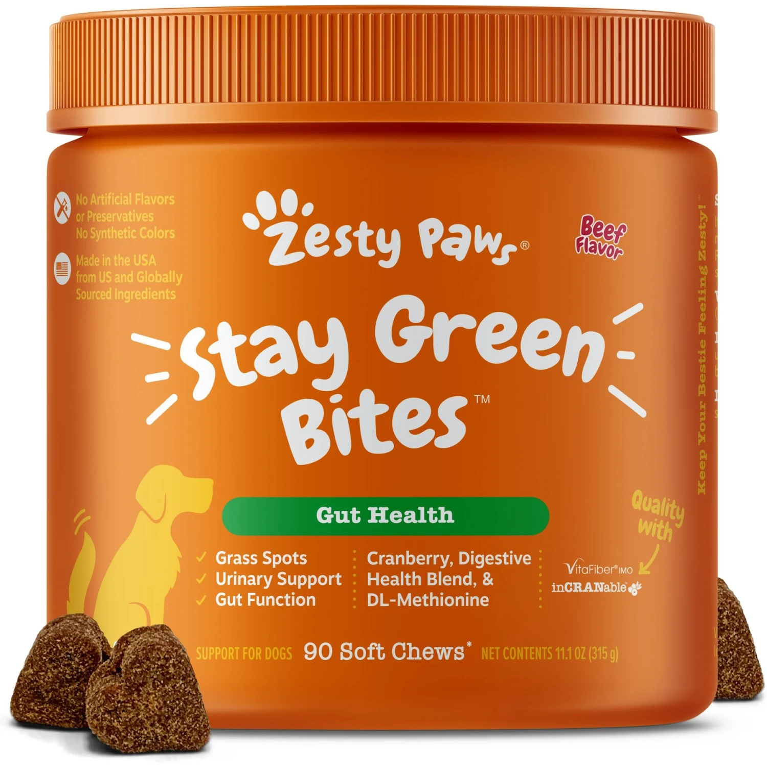- Stay Green Bites are functional soft chew supplements that may help with grass burn from dog urine, while also providing digestive support.