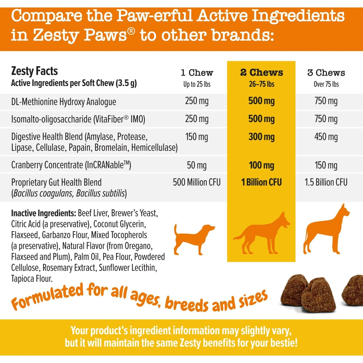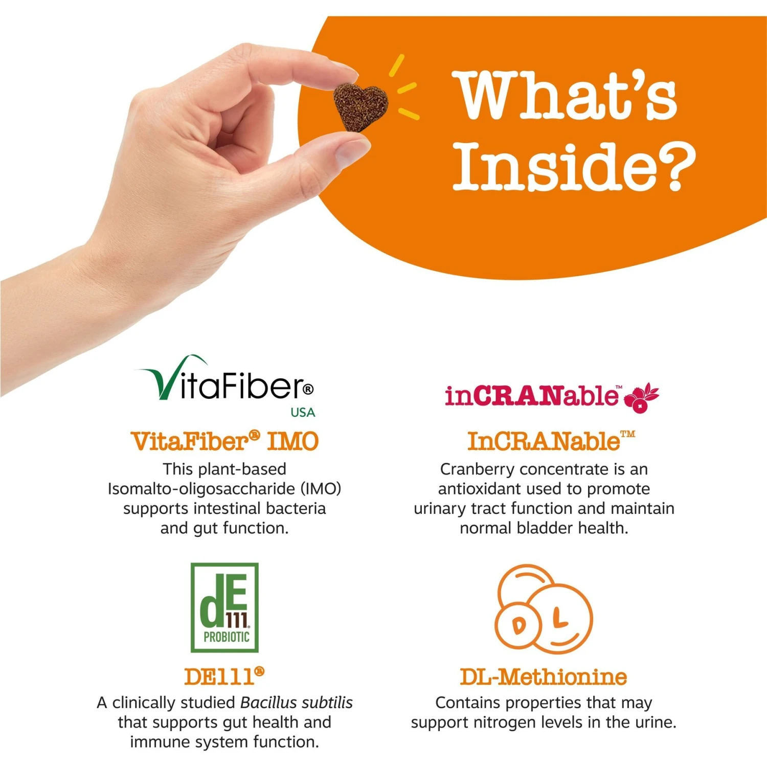 If your pup creates a patch or two of burn spots on your grass when nature calls for potty time, our Stay Green Bites may be able to help! Featuring a blend of advanced ingredients, these flavorful soft chews support the urinary tract and gut health to support your green grass. This functional chewable dog supplement features DE111 Probiotic (Bacillus subtilis) and VitaFiber, which are premium ingredients that support intestinal bacteria and gut function. These chews also include Cran-Max (cranberry concentrate) with antioxidants that’s clinically studied to help support urinary tract health. Plus, these chewables also include DL-Methionine, a premium Gut Health Blend (with Amylase, Protease, Lipase, Cellulase, Lactase, Bromelain enzymes) for additional support for urinary and gut health plus Apple Cider Vinegar (ACV). Best of all, pets love the delicious taste! Also, pet moms and dads can let out a sigh of relief knowing that while their pups are feeling spoiled with special treatment, they’ll also be getting the premium support they desire.