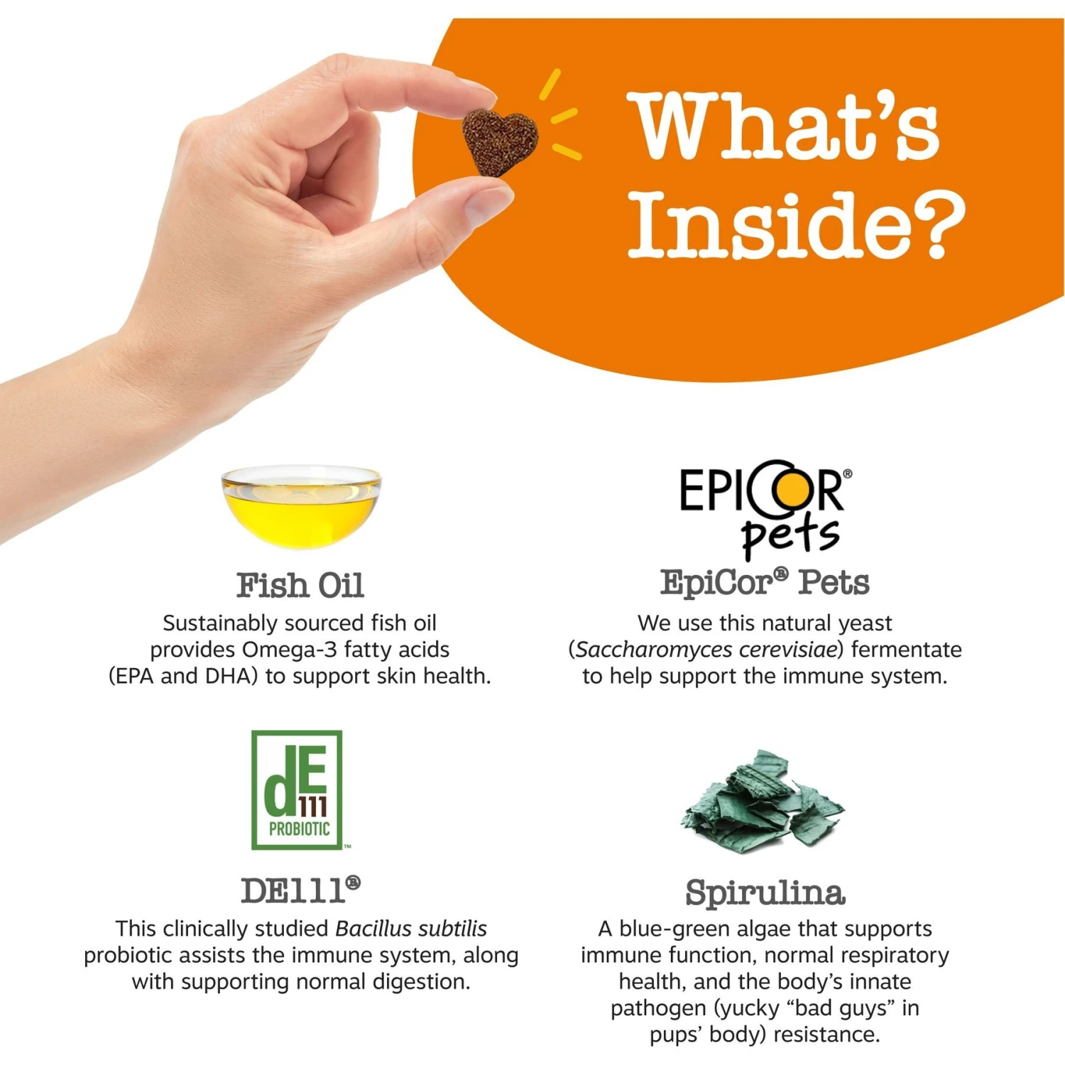 - Each chew features EpiCor Pets and 1.5 billion CFU of DE111 probiotic to support your pup’s immune system and gut flora.